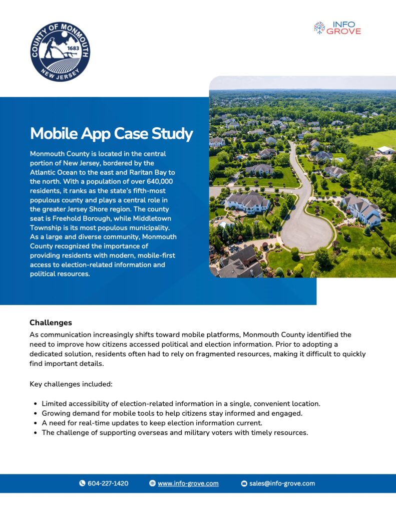 Keep your citizens informed and engaged with Info Grove, a user-friendly mobile hub for all civic information, driving transparency and active participation.