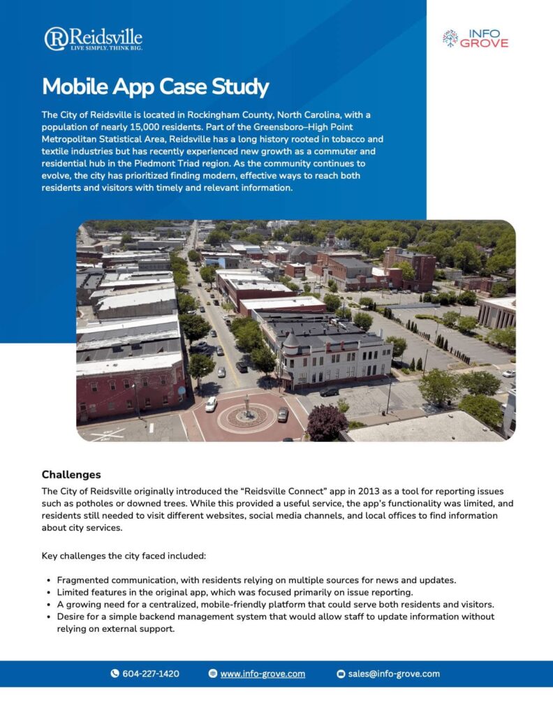 From citizen alerts and push notifications to resident complaints and streamlined communication, Info Grove’s mobile app platform helps your community stay informed and connected.